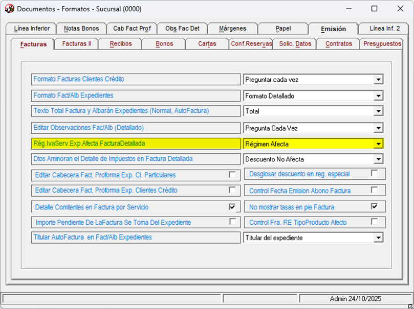 La opción se llama “Rég.IvaServ.Exp.Afecta Factura detallada”, y debe estar en “Régimen afecta”