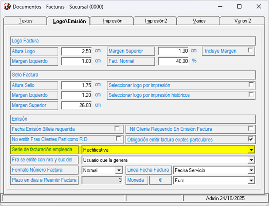 Esta opción se encuentra en “Utilidades -> Configuración -> Sucursales -> (Sucursal pertinente) -> Documentos -> Facturas -> Logo\Emisión”, y la opción se llama “Serie de facturación empleada”