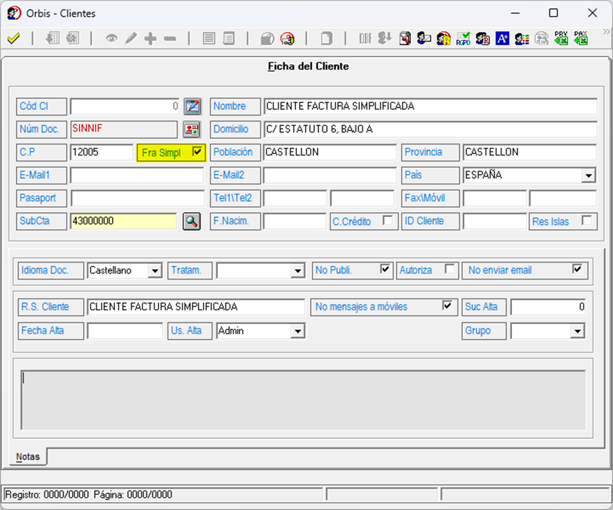También debemos activar la opción de que el NIF sea obligatorio para dar de alta un cliente. Esta se encuentra en “Utilidades -> Configuración -> Sucursales -> (Sucursal pertinente) -> Campos Requeridos”. Para que el campo sea obligatorio, tiene que mostrarse en rojo.